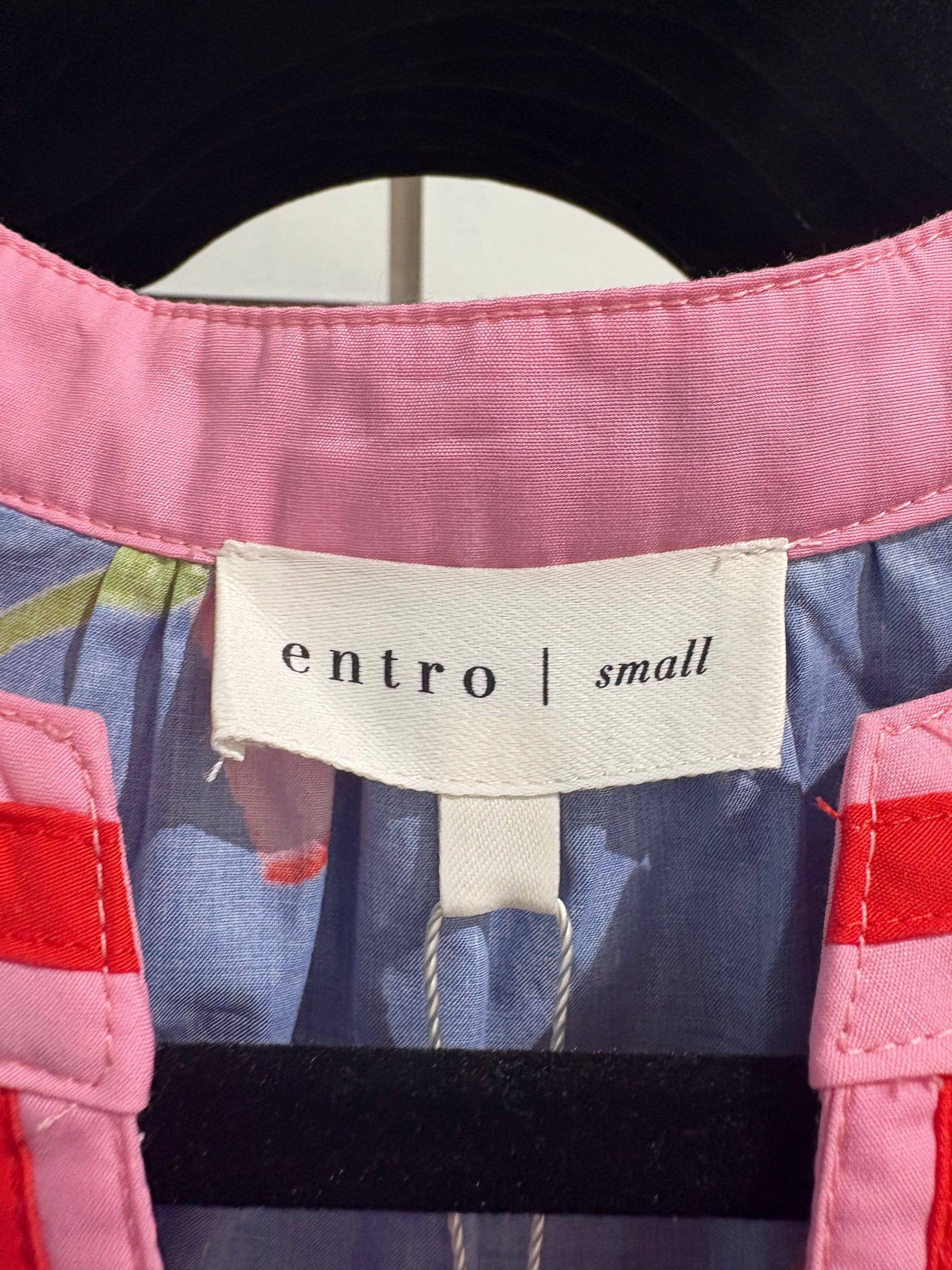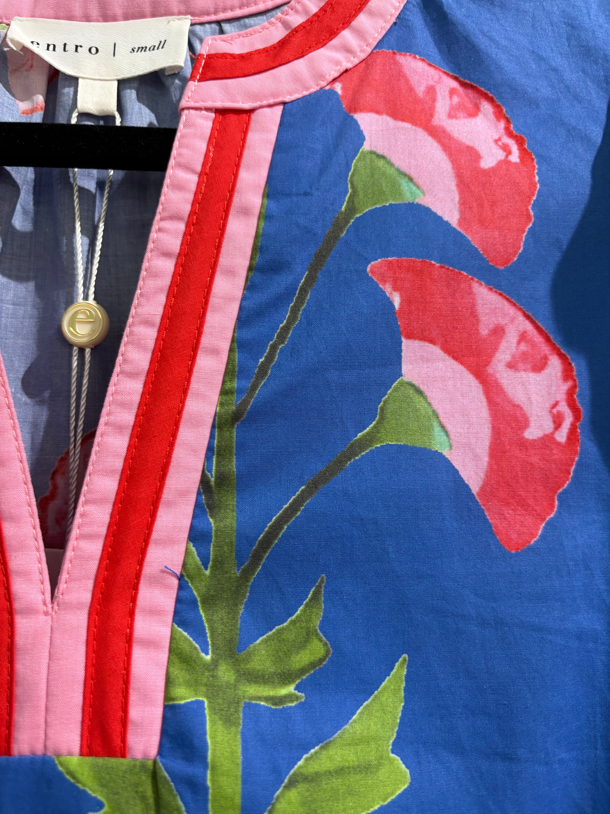 Add a pop of color and a touch of femininity to your wardrobe with this blue flowered entro blouse. The delicate pink and red flowers make it perfect for any occasion, and the puff sleeves add a playful touch. Pair it with your favorite bottoms for a stylish look.