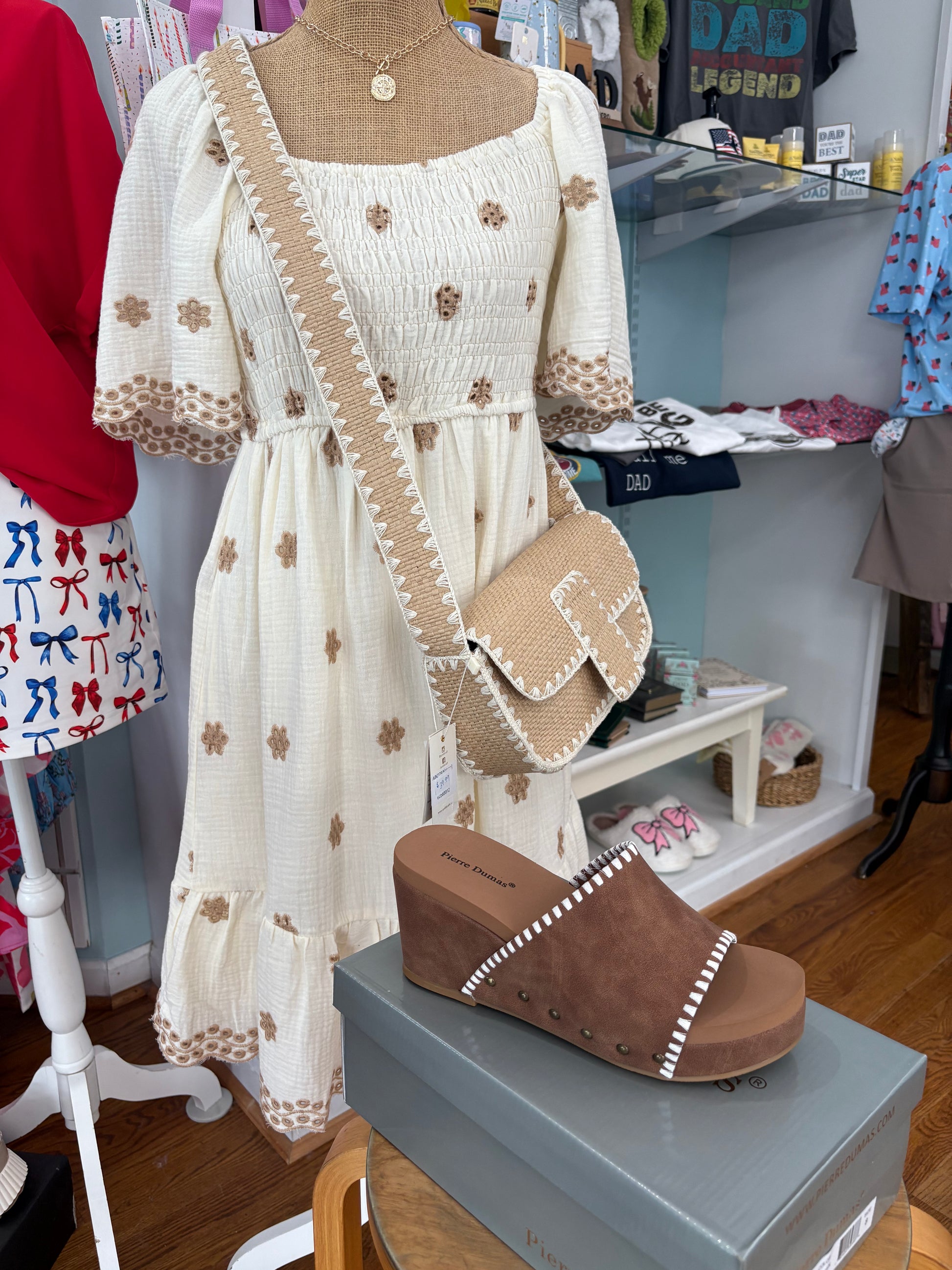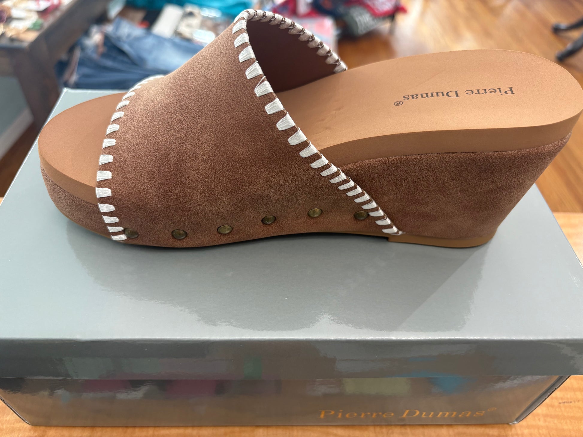Elevate your summer wardrobe with the Pierre Dumas Brown wedge sandal. This versatile heel instantly dresses up any outfit, from dresses to jeans, while providing all-day comfort with its cushioned footbed. A must-have for any closet, this neutral sandal is the perfect summer basic.