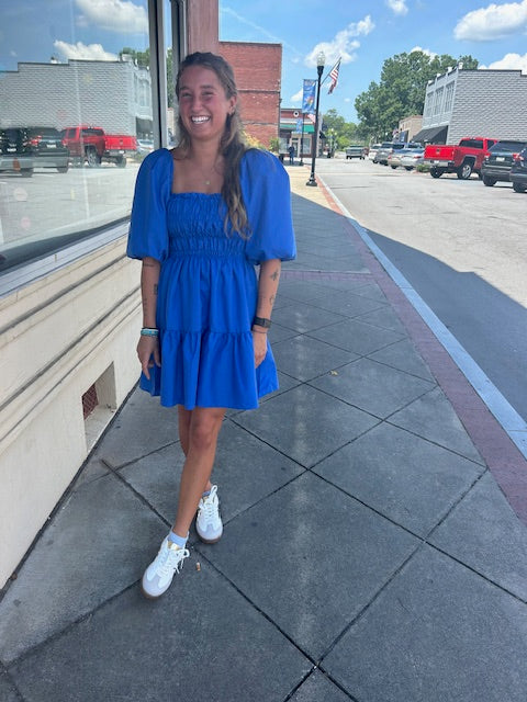 Step into Sunshine with our Blue Skies Smocked Dress! This vibrant royal blue dress features a flattering smocked bodice, puff sleeves and a flowy tiered skirt for a breezy, feminine look. Perfect for brunch, shopping days, or casual vacation strolls. Pair with our sneakers for a sporty twist or dress it up with sandals. Comfortable, chic, and effortlessly fun!