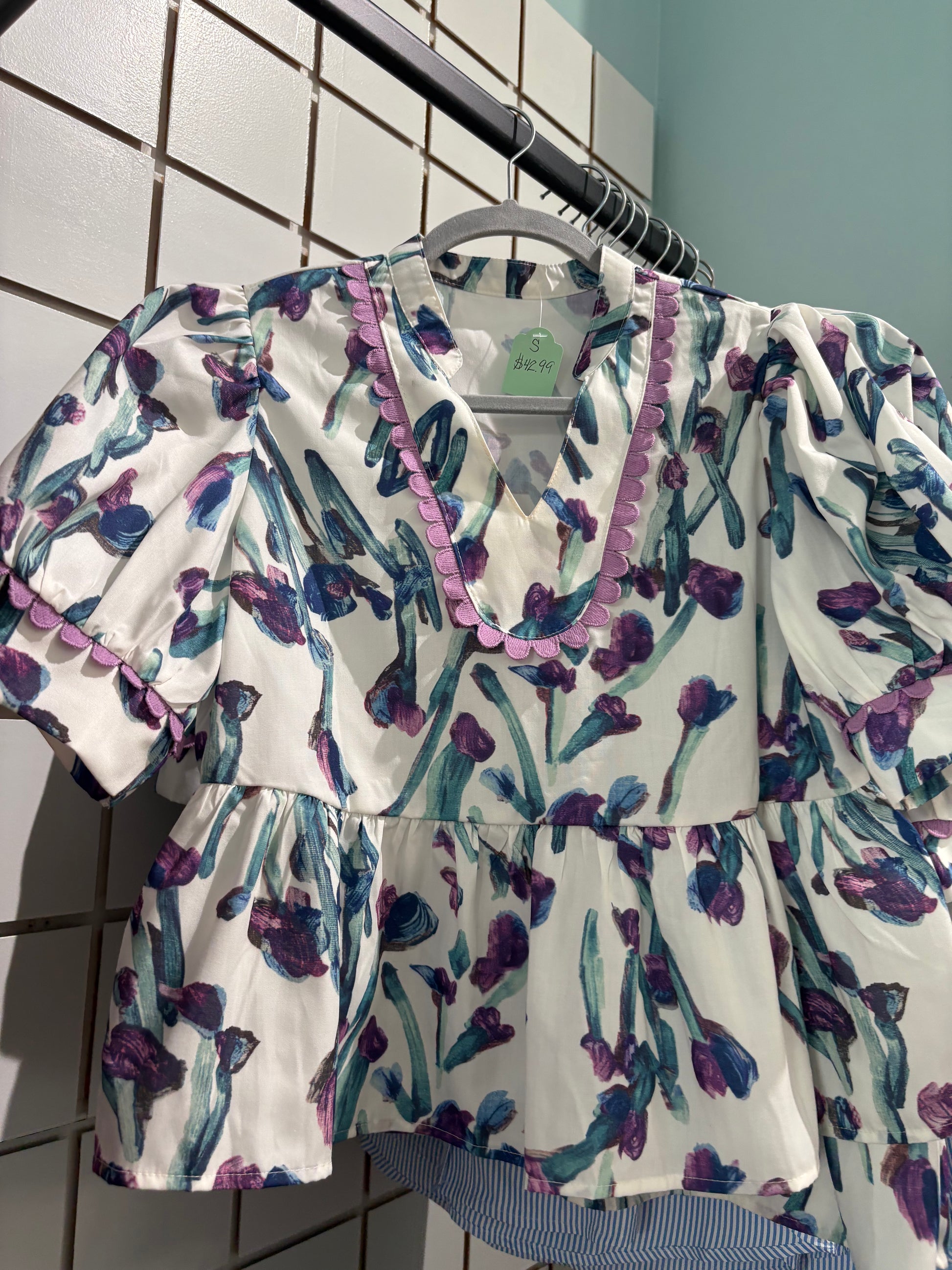 This T&C Apparel floral white blouse is a must-have addition to your wardrobe. The white fabric is adorned with a beautiful blue and purple floral pattern, adding a touch of elegance to any outfit. The blouse features a subtle purple scallop detail on the neckline and mid-sleeve, making it a perfect blend of femininity and sophistication. The V-neckline adds a modern touch to this classic piece.