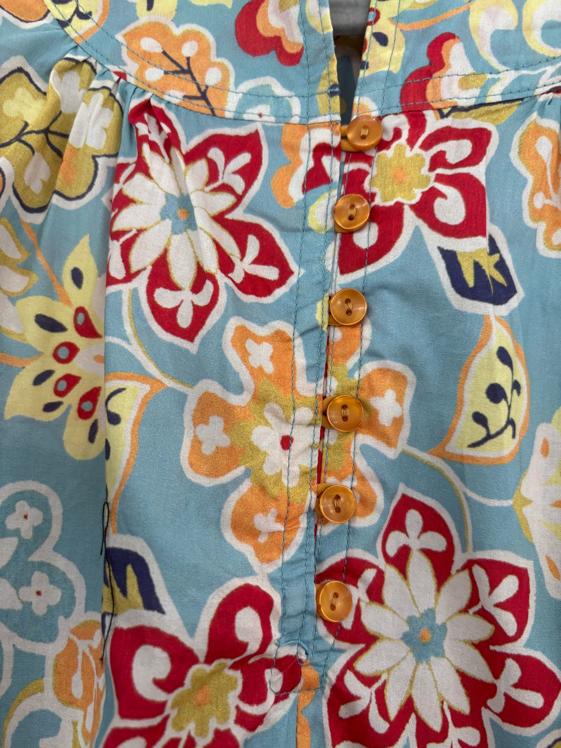 "The Umgee Floral Dress features a stunning teal background adorned with orange and red flowers, accented by pops of green. The cute orange buttons on the front, along with the scolloped edges on the sleeves and ruffle on the bottom hem, add a touch of charm to this beautiful dress."