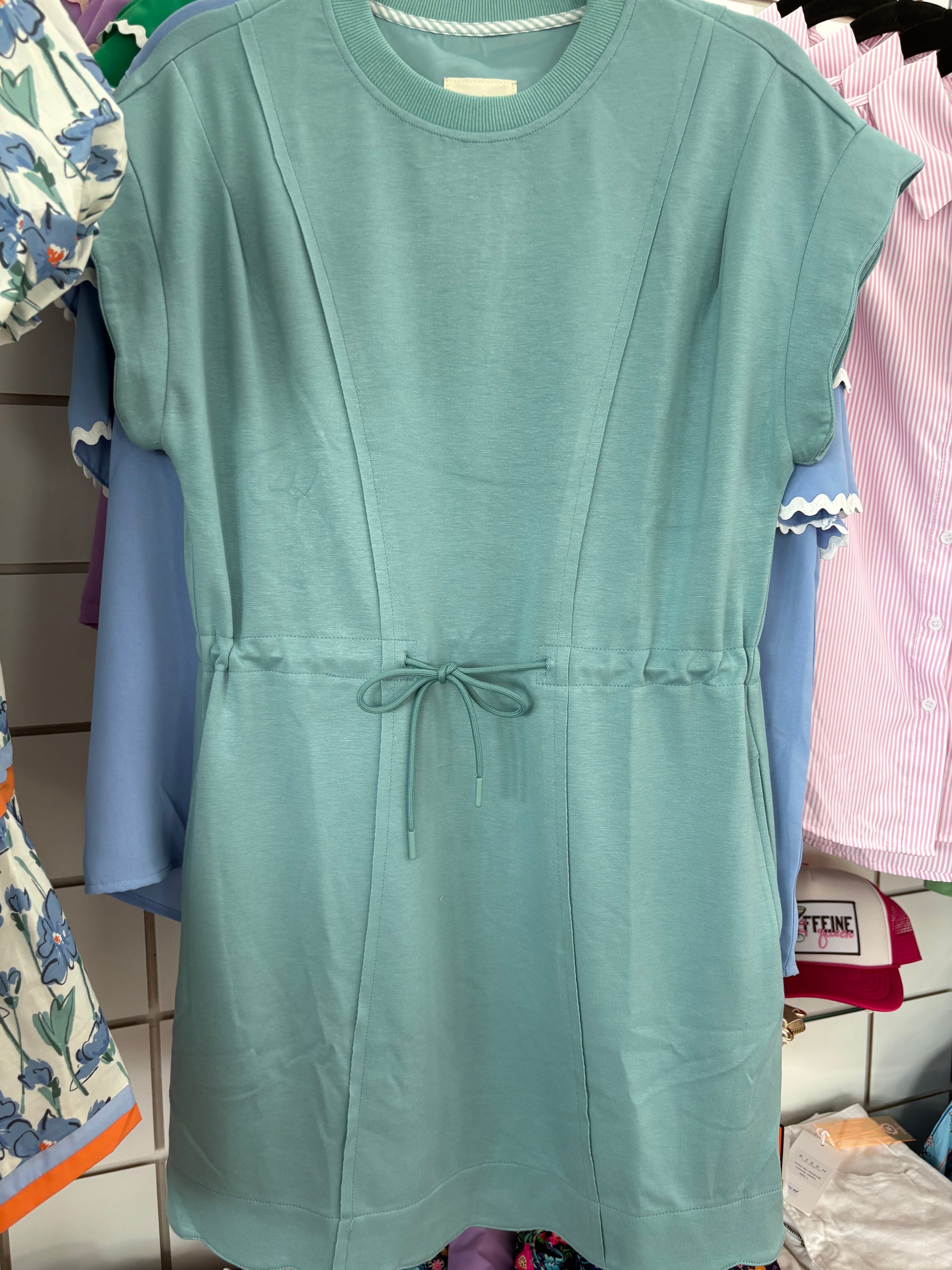 Effortlessly transition from athletic to dressy in the Umgee tie waist dress. The teal hue adds a pop of color while the tie at the waist allows for a customized fit. With stylish scalloped details on the sleeves and hem, this dress is perfect for any occasion.