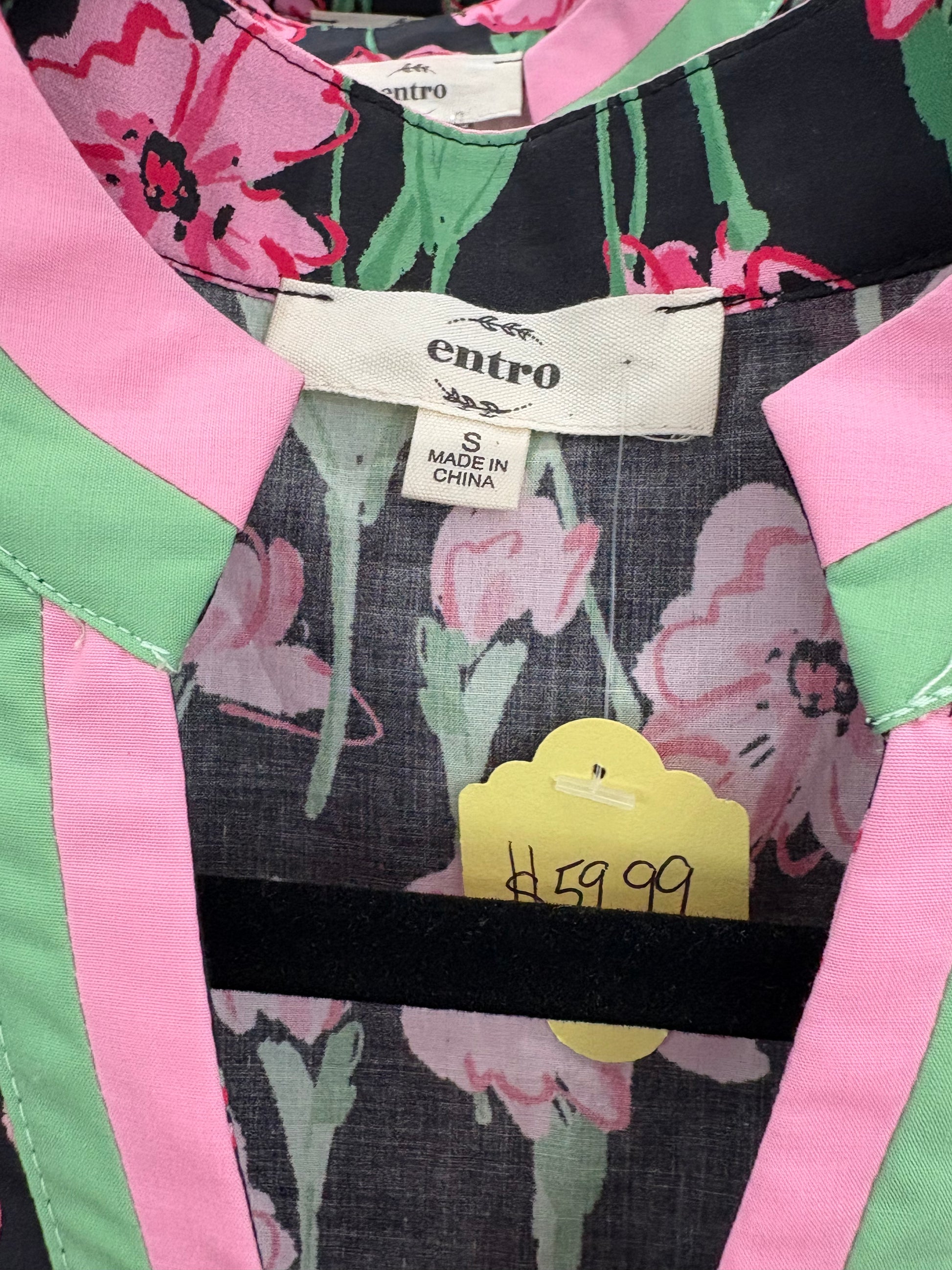 This Entro dress features a stunning black color with delicate pink floral patterns and vibrant green accents. Adorned with puff sleeves and a playful cut, this dress offers both style and charm. Perfect for any occasion, this dress is a must-have for any fashion-forward individual.